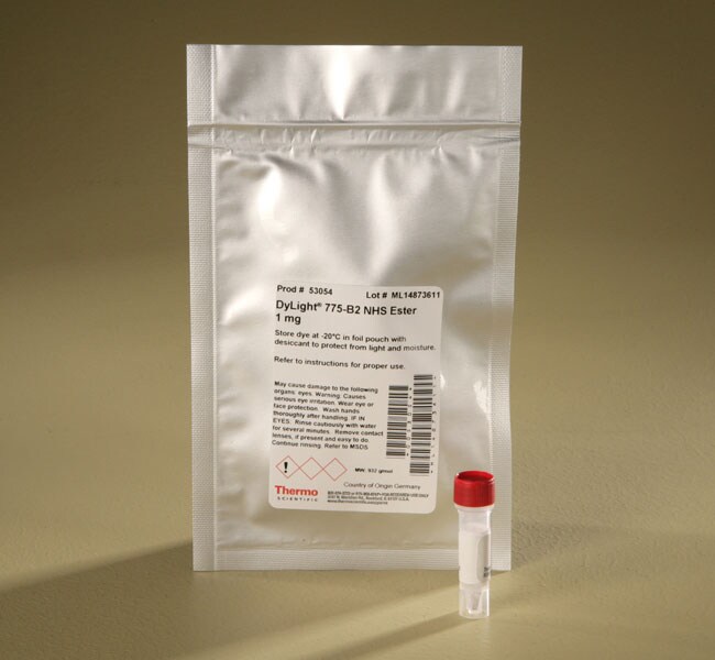 Thermo Scientific DyLight near-infrared specialty dyes, comparable to Alexa Fluor and IRDye NIR dyes, can be used to label antibodies, peptides, and other proteins at primary amines. DyLight 775-B2 dye has a structure based on the benzopyrillium core, with 2 sulfonates. It has excitation and emission peaks at 772 and 787 nm, respectively (in ethanol).