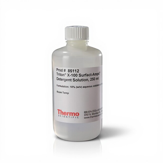 Thermo Scientific Triton X-100 Surfact-Amps Detergent Solution is a highly-purified Triton™ X-100 detergent stabilized as a 10% solution (w/v) in variable sizes packaged under nitrogen in 10 mL glass ampules or three sizes of non-leaching HDPE bottles, ensuring their stability and eliminating the accumulation of peroxides and degradation products.