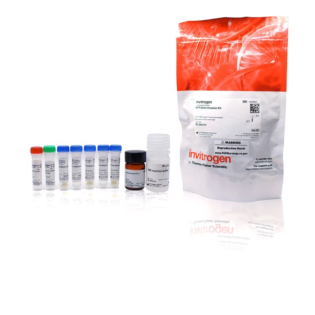 The ATP Determination Kit is a highly sensitive luminescence assay designed for the quantitative detection of ATP levels in biochemical and cell viability assays. This ATP assay kit utilizes the reaction between recombinant firefly luciferase and its substrate D-luciferin and is based on luciferase’s absolute requirement for ATP in producing light (emission maximum approximately 560 nm at pH 7.8). With its exceptional sensitivity, capable of detecting as little as 0.1 picomole of ATP, this assay is well-suited for kinetic studies and can be used with luminometers or microplate readers equipped with a luminescence mode, such as the Thermo Scientific Varioskan ALF and LUX Multimode Microplate Readers.