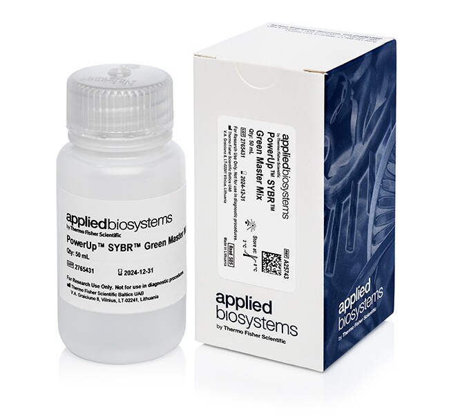 PowerUp™ SYBR™ Green Master Mix is a pre-formulated, optimized, universal 2X master mix for real-time PCR workflows. Coupled with user-supplied primer sets and template, PowerUp™ SYBR™ Green Master Mix is designed to amplifiy targets for accurate gene expression analysis.