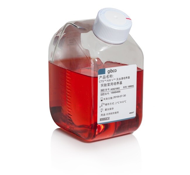 CTS AIM V SFM is available in a 1-liter bottle for small volume users as well as a 10-liter bag for larger volume users. Full traceability documentation such as Certificate of Origin, Certificate of Analysis, and Drug Master File are available.