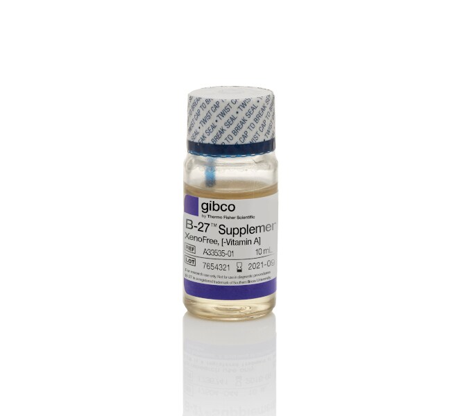 B-27 Supplement, XenoFree, minus vitamin A, is a Research Use Only supplement based on the classic B-27 Supplement formulation and contains human-derived components and recombinant proteins.