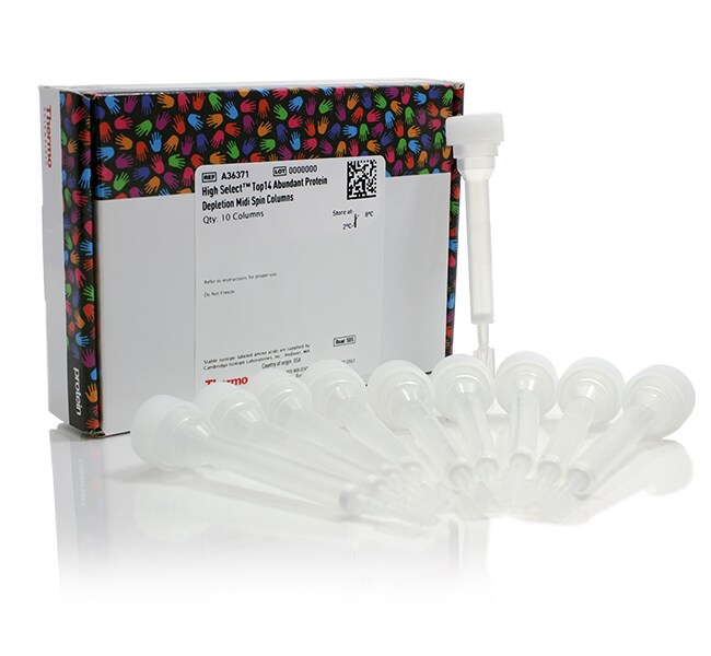 High Select HSA/Immunoglobulin Depletion Resin uses highly specific, immobilized anti-HSA and anti-immuoglobulin antibodies (IgG, IgA, IgM, IgD, and IgE) to remove human serum albumin (HSA) and all major subclasses of immunoglobulins from serum and plasma. High Select Top14 Abundant Protein Depletion Resin uses highly specific immobilized antibodies to remove human serum albumin (HSA), albumin, IgG, IgA, IgM, IgD, IgE, kappa and lambda light chains, alpha-1-acidglycoprotein, alpha-1-antitrypsin, alpha-2-macroglobulin, apolipoprotein A1, fibrinogen, haptoglobin, and transferrin from serum, plasma, or spinal fluids. The resins are provided in an economical and convenient spin column format specifically designed for one-step processing and single use or bulk format for custom filling.