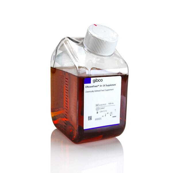 Gibco EfficientFeed A+ 3X Supplement is a single-part liquid supplement for fed batch addition to the culture of multiple cell lines to assist with process development and maximization of bioreactor utilization.