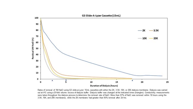Slide-A-Lyzer G3 Dialysis Cassettes are available for five different sample volumes ranging from 1 to 125 mL with molecular weight cut offs (MWCOs) of 2K, 3.5K, 10K, and 20K. Slide-A-Lyzer G3 Cassettes with the 10K MWCO are also offered in electron beam-treated format for applications such as cell culture, virus purification, or sample preparation for applications requiring conditions that minimize the risk of sample contamination.