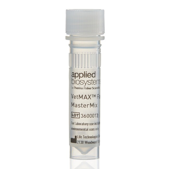 VetMAX Fast Multiplex Master Mix with ROX is designed to be a fast-cycling-capable, multiplex-assay-compatible one-step RT-PCR master mix for testing in animal-derived samples. It can be used to amplify pathogenic DNA and RNA present in a variety of animal sample matrices, including ones with challenging PCR inhibitors. The fast-cycling capability, combined with multiplexing compatibility, allows for rapid and accurate real-time PCR results in <50 minutes.
