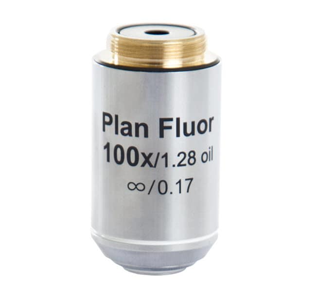 Fluorite objectives deliver excellent resolution and are made with higher numerical apertures than achromat objectives, resulting in brighter fluorescence signal and higher contrast imaging. The higher optical quality greatly reduces optical aberrations, and corrections for color and focus are at higher levels than achromat objectives. Fluorite objectives are ideally suited for fluorescence and demanding transmitted light applications, where the higher contrast make them ideally suited for color imaging.