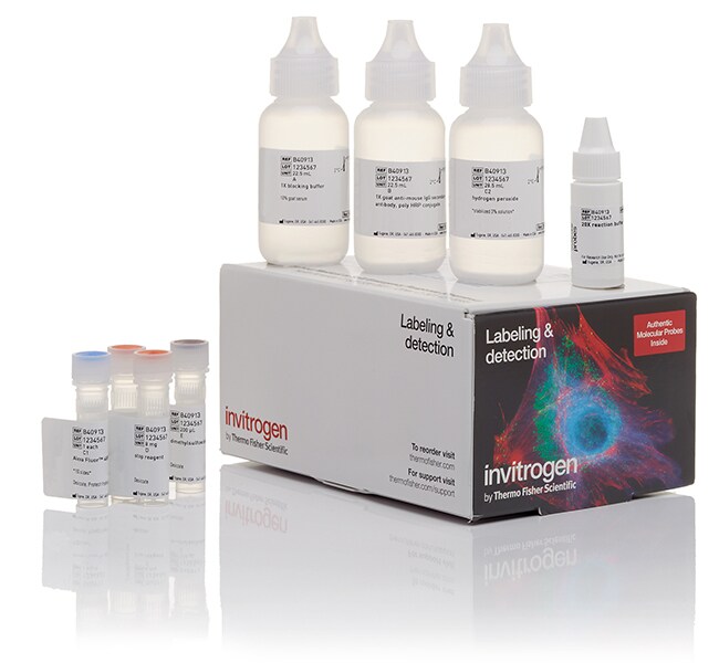 Enhancement of signal using Alexa Fluor tyramides: SuperBoost kits utilize Alexa Fluor tyramides, which react with HRP to ultimately deposit bright and photostable Alexa Fluor dye on surrounding proteins and other similar molecules. SuperBoost kits are the only kits that combine the brightness of Alexa Fluor dyes with the enhancement of tyramide signal amplification to produce a superior signal.