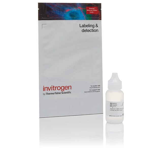 SuperBoost™ Goat anti-Rabbit Poly HRP is a component in SuperBoost™ tyramide signal amplification kits made available separately here. SuperBoost™ Goat anti-Rabbit Poly HRP can be used with any HRP sustrate such as tyramide, DAB for signal amplification and detection. The molar enzyme/antibody protein ratio has an average value of '4'. This reagent is provided at a ready-to-use 1X concentration, enough for 150 slides.