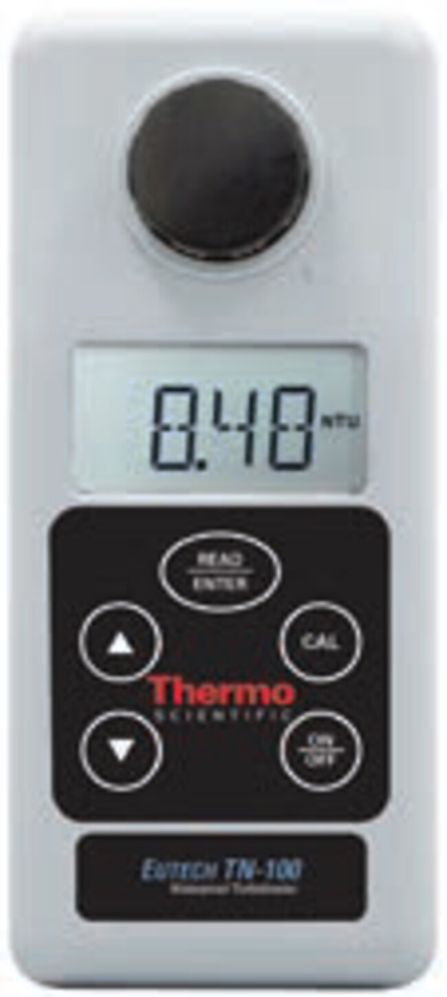 DescriptionWaterproof TN-100 handheld turbidimeter with set of 4 calibration standards (800, 100, 20.0 & 0.02 NTU), set of 7 sample vials, lint-free cloth, silicone oil, batteries, and hard carrying case
