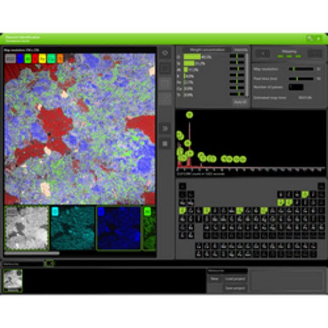 The Thermo Scientific™ Elemental Mapping Software is an option within the EID software package (that comes default with the Thermo Scientific™ Phenom™ EDX solution). Elemental mapping reveals the distribution of elements within the sample. Here the previously selected elements for the spot analysis can be mapped at a user-specified pixel resolution and acquisition time. The real-time mapping algorithm shows the live build-up of the selected element maps while storing spectra of each pixel. This allows elements to be added or removed at any time during or after the mapping process.