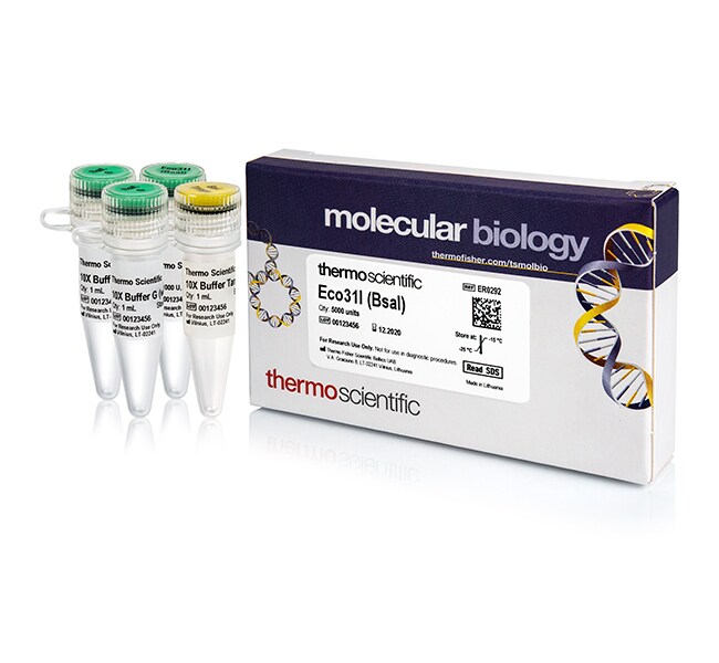 Thermo Scientific Eco31I (BsaI) restriction enzyme recognizes GGTCTC(1/5)^ sites and cuts best at 37°C in G buffer (Isoschizomers: BsaI, Bso31I, BspTNI). See