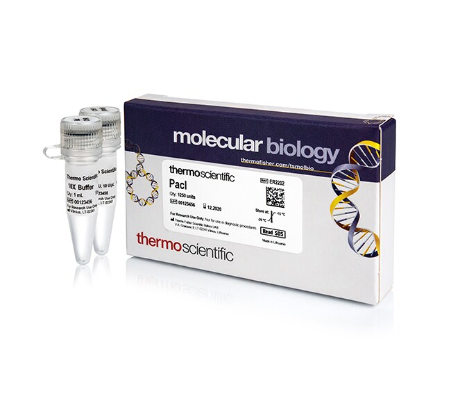 Thermo Scientific PacI restriction enzyme recognizes TTAAT^TAA sites and cuts best at 37°C in its own unique buffer. See