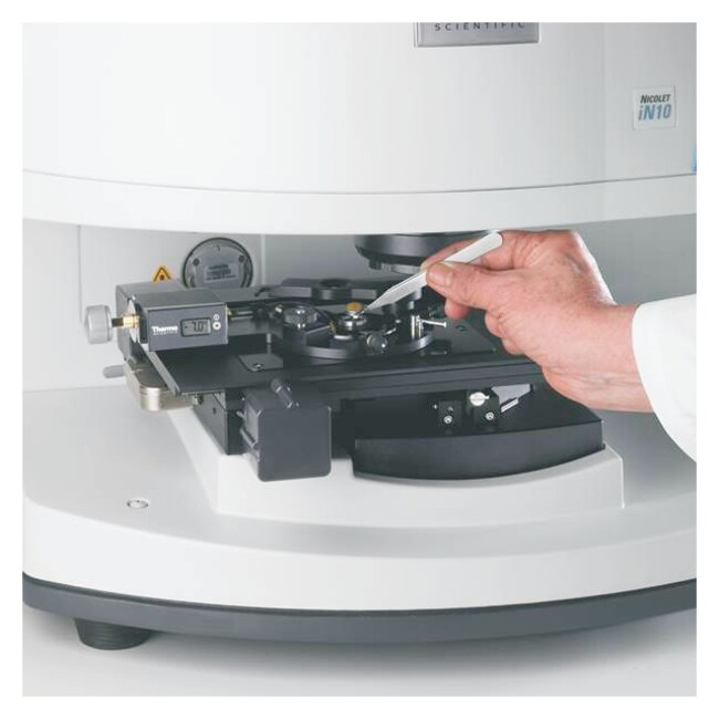 The Thermo Scientific™ Imaging ATR Accessory provides enhanced spatial resolution and high speed data acquisition for FT-IR chemical imaging applications. The Thermo Scientific Imaging ATR accessory expands our portfolio of ATR products for Thermo Scientific Nicolet™ infrared microscopes with a tool uniquely suited to support chemical imaging studies with enhanced spatial resolution. Imaging a sample in contact with a germanium ATR crystal effectively improves the resolution by a factor of four. The Imaging ATR Accessory is a faster alternative to single point ATR mapping because only a single, large area, contact point is required. Coupling ATR with an infrared microscope creates a unique capability to explore the microscopic structure of heterogeneous samples. Observable features in specimens such as defects, particles, fibers or inks may be analyzed just by contacting the feature with the ATR crystal surface using guidance from microscope viewer.