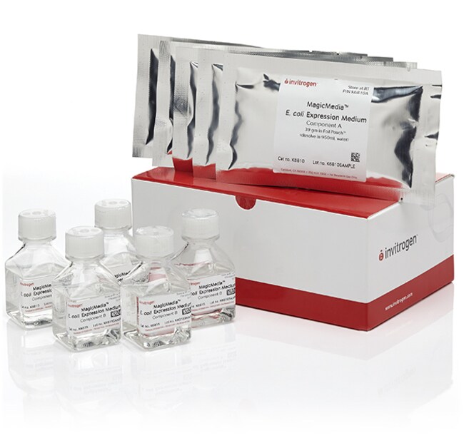 E. coli Expression Medium, powder, consists of a proprietary Component A (in foil pouch powder format) and Component B (in buffer liquid format).