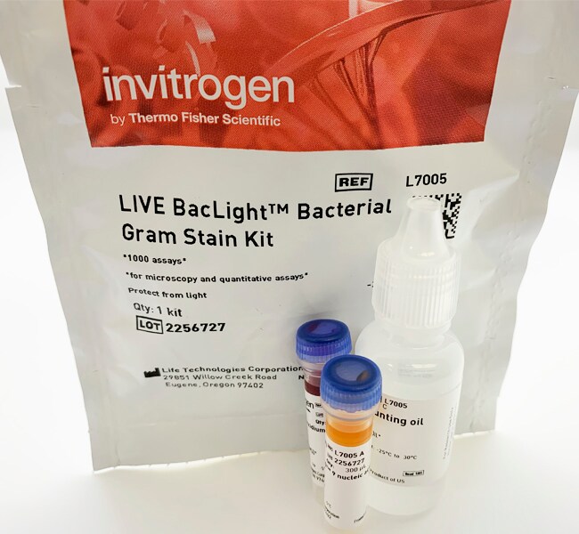 The LIVE BacLight™ Bacterial Gram Stain Kit provides a novel one-step fluorescence assay for the determination of gram sign in living bacteria. When gram negative and gram-positive bacterial are simultaneously stained with the membrane-permeant SYTO 9 dye and hexidium iodide, gram-negative bacteria fluoresce green and gram-positive bacteria fluoresce red.