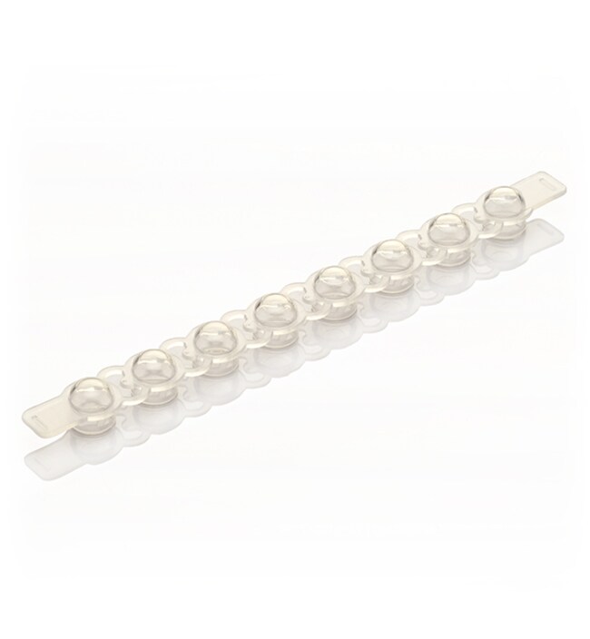 Strip of 8 attached caps for use with 0.2 mL individual tubes, strip tubes (0.1 or 0.2 mL), or 48- or 96-well plates. Natural (clear) color.