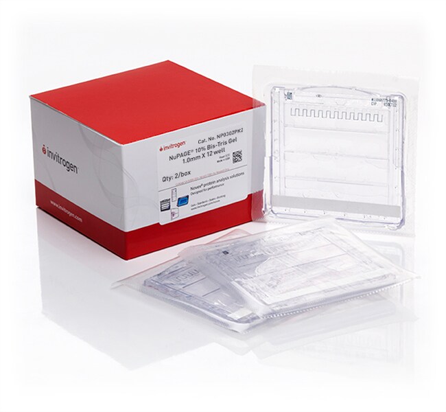 Obtain optimal separation of your proteins by choosing the right combination of gel and running buffer. NuPAGE Bis-Tris protein gels come in four polyacrylamide concentrations: 8%, 10%, 12%, and a 4–12% gradient. Gels come in two sizes: mini (8 cm x 8 cm) or midi (8.7 cm x 13.3 cm) and either 1.0 mm (mini and midi gels) or 1.5 mm (mini gel format only) in thickness. NuPAGE Bis-Tris gels also come in multiple well formats.