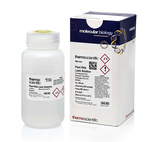 Thermo Scientific GeneJET Plant RNA Lysis Solution is a component of the GeneJET Plant RNA Purification Mini Kit (K0801/K0802) and may be purchased separately. Provided in 200 mL aliquots.