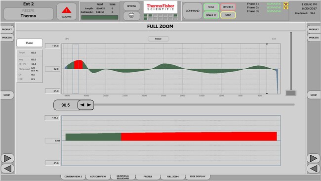 Automatic Profile Control (APC) uses advanced mapping strategies for both the linear and non-linear (neck-in) regions of the extruded product. Machine Direction (MD) thickness control strategies include controlling line speed, screw or pump speed, or extruder ratio, to maintain the extruded product to thickness specifications. Options for increasing output (Throughput Control) and minimizing resin usage (Target Management Control) are also available. Target Management Control adjusts product to a system-calculated dynamic target, providing both low point and low average protection.
