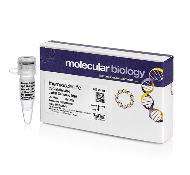 Thermo Scientific CpG Methylated Jurkat Genomic DNA is human male genomic DNA from Jurkat cells, enzymatically methylated with CpG Methyltransferase (M.SssI). Genomic DNA was isolated from Jurkat (human acute T-cell leukemia) cells grown to confluency in RPMI media supplemented with 10% bovine fetal serum. Isolated genomic DNA was treated with CpG Methyltransferase, repurified, and dissolved in TE buffer. ≥ 98% CpG methylation level confirmed by bisulfite sequencing.
