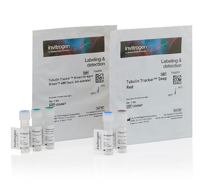Contains sufficient material for at least 60 slides each for Tubulin Tracker Green and Tubulin Tracker Deep Red at 1 mL / slide and 1 x working concentration.This kit contains one Tubulin Tracker Green kit (Cat. No. T34078) and one Tubulin Tracker