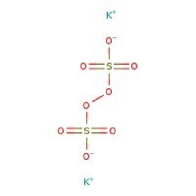 A polymerization accelerant for PAGE gels. Potassium peroxydisulfate is used as an oxidizing agent in organic synthesis. It is involved in Elbs persulfate oxidation of phenols and the Boyland-Sims oxidation of anilines. Upon solution, it gives radicals and is used to initiate polymerization reactions to prepare styrene-butadiene rubber and polytetrafluoroethylene. It is used as bleaching agent in various hair bleaches, ion exchange agents, plating agents and surface treating agents.