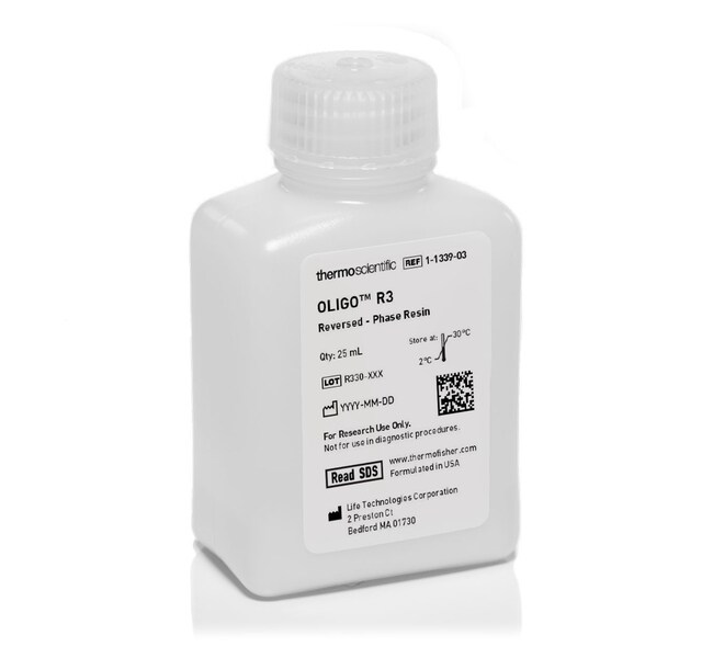 Thermo Scientific™ Oligo™ R3 散装树脂是一种设计用于多核苷酸和其他生物分子的反相色谱分析的硬质聚合微珠。结合 30 μm 粒径、对高 pH 值的抗性以及高相比,使 Oligo R3 树脂特别适用于合成寡核苷酸和肽的制备纯化。填料由交联的聚二乙烯基苯粒子组成。Oligo R3 散装树脂在选择性方面与传统硅基反相树脂稍有不同,与高碳加载(通过 C18)的支持物相似。此外,完全缺失残留硅烷醇活性可能改变离子种类的选择性。
