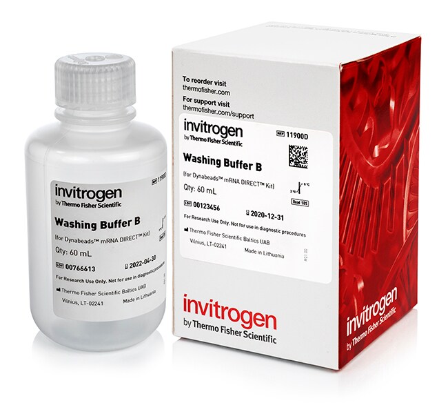 该洗涤缓冲液 B 包含在以下 Dynabeads™ mRNA 纯化试剂盒中:货号 61006、61011、61012 和 61021。此款试剂盒可单独提供,用于需要比试剂盒中提供更多洗涤缓冲液 B 的应用。