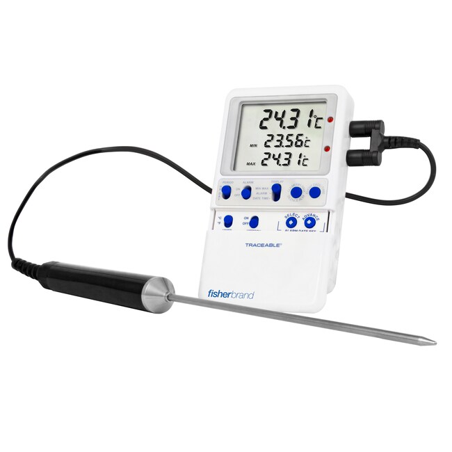 显示最近 24 小时(每小时)、7 天(每天)或最近 31 天(每天)的最小/最大读数。带铂防水不锈钢探头的 Fisher Scientific™ Traceable™ 铂高准确度冷藏冰箱/冷冻冰箱温度计的吸头可穿入 0.3 in. 且具有防水线缆,从而可提供准确读数。
