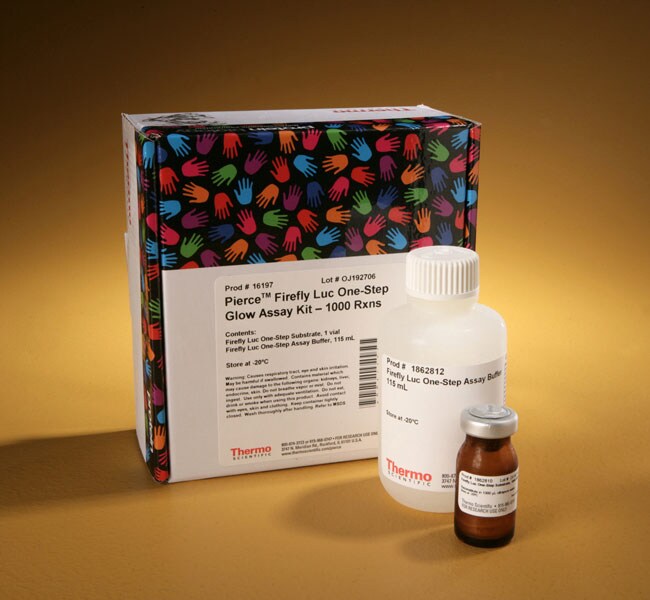 TurboLuc Luciferase One-Step Glow Assay Kit measures activity in mammalian cells with a single reagent-addition step, making it ideal for high-throughput screening (HTS) applications. Several features of the TurboLuc Luciferase One-Step Glow Assay Kit make it suitable for luminometers without injectors and for HTS applications. The convenient, one-step, homogenous protocol minimizes handling steps to support the use of automation. Simply combine the supplied substrate solution and assay buffer to make a single working solution, and then add it to microplate containing the transfected, treated cells. The stable signal output (glow enzyme kinetics) of this system provides flexibility with regard to lead time before read. When used with Thermo Scientific TurboLuc 16 Luciferase vectors, the TurboLuc Luciferase One-Step Glow Assay Kit provides a highly sensitive bioluminescent reporter assay system for the detection of promoter or pathway activity.