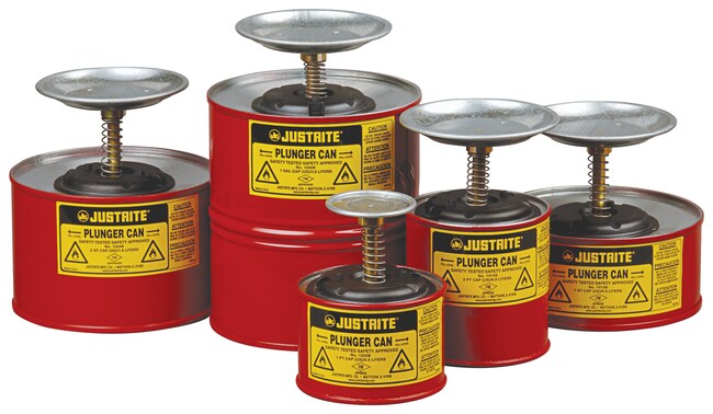 Justrite 柱塞分配罐提供一种用易燃清洁液润湿布的快速、安全方法。泵基座由耐化学腐蚀的 Ryton™ 和黄铜制成,设计用于在补液前在底部留有较少液体。