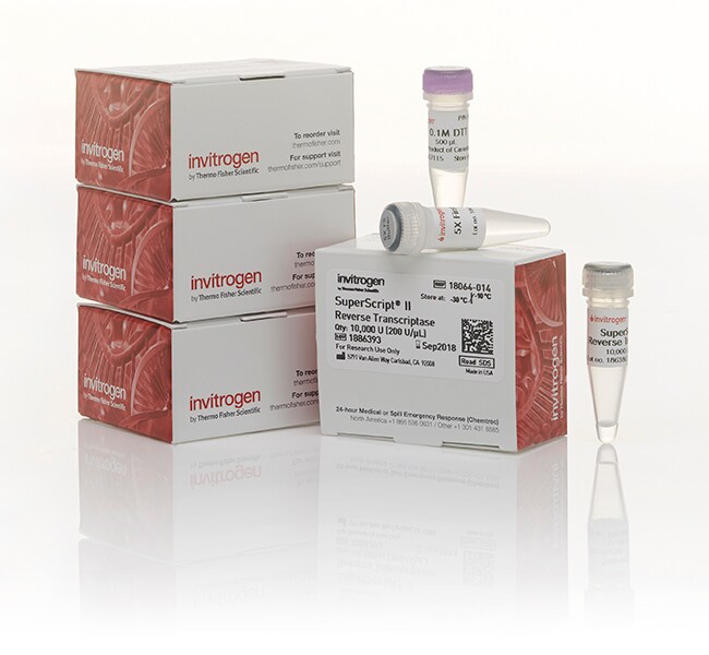 Invitrogen SuperScript II 反转录酶是经过基因改造的 MMLV 反转录酶 (RT),相较于野生型 MMLV RT,其 RNase H 活性较低,热稳定性较高。这种酶的 RNase H 结构域突变消除了在第一链 cDNA 合成过程中 RNA 的降解,从而使全长 cDNA 产量更高。