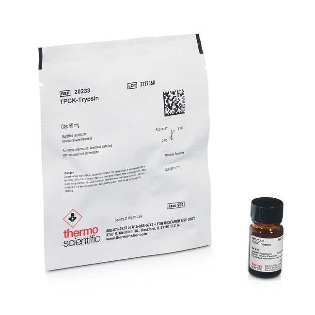 Thermo Scientific Pierce TPCK Trypsin is a serine endoprotease that is applicable to amino acid analysis and protein sequencing, mapping and structural studies; the immobilized form allows sample separation after treatment.