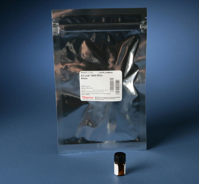 Thermo Scientific EZ-Link NHS-PEG4-生物素是一种聚乙二醇化水溶性试剂,可对抗体、蛋白和其他含伯胺的大分子进行简单高效的生物素标记。