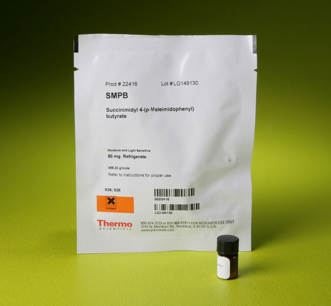 SMPB (succinimidyl 4-(p-maleimidophenyl)butyrate) is covered under our general 1-year warranty and is guaranteed to be fully functional for 12 months from the date of shipment, if stored as recommended. Please see section 8.1 of our Terms & Conditions of Sale (https://www.thermofisher.com/content/dam/LifeTech/Documents/PDFs/Terms-and-Conditions-of-Sale.pdf) for more details.