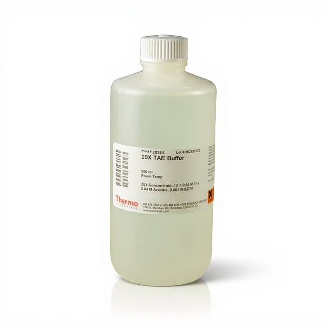 20X TAE 缓冲液是一种节省空间的储备液,非常适合制作和制备用于核酸琼脂糖凝胶电泳的 Tris-乙酸盐 EDTA (TAE) 运行缓冲液。用水稀释至 1X 后,pH 值为 8.2-8.4 的 0.04 M Tris、0.04 M 醋酸盐、1 mM EDTA 缓冲液可直接使用。