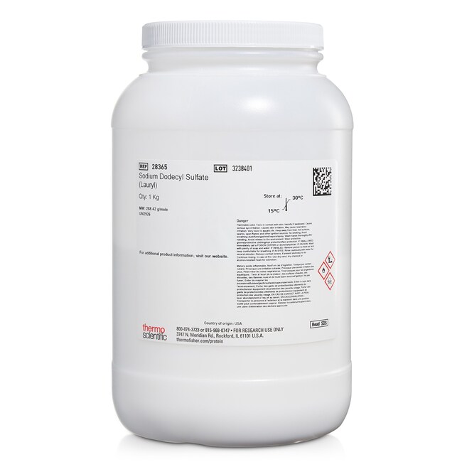 Thermo Scientific 十二烷基硫酸钠(十二烷)是一种标准级 SDS 去污剂,用于蛋白聚丙烯酰胺凝胶电泳 (PAGE)。