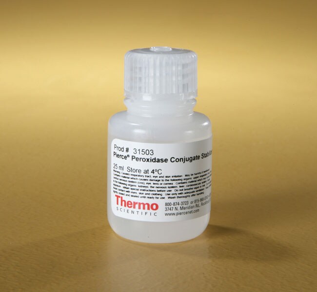 Pierce 过氧化物酶偶联物稳定剂可用于储存过氧化物酶偶联抗体、链霉亲和素和其他蛋白(HRP 偶联物)。将稳定剂与 HRP 偶联物溶液按 2:1 或 1:1 比例混合(通常至少 1 mg/mL)即可得到稳定的偶联物储备液,该溶液在 -20°C 下仍可保持液态。用户可以从零下温度条件下直接移取偶联物,避免反复冻融损害酶活性。稳定剂溶液纯度高,不含氧化剂和其他可能损害酶活性的污染物,确保储备液可保存数月而无显著活性损失。