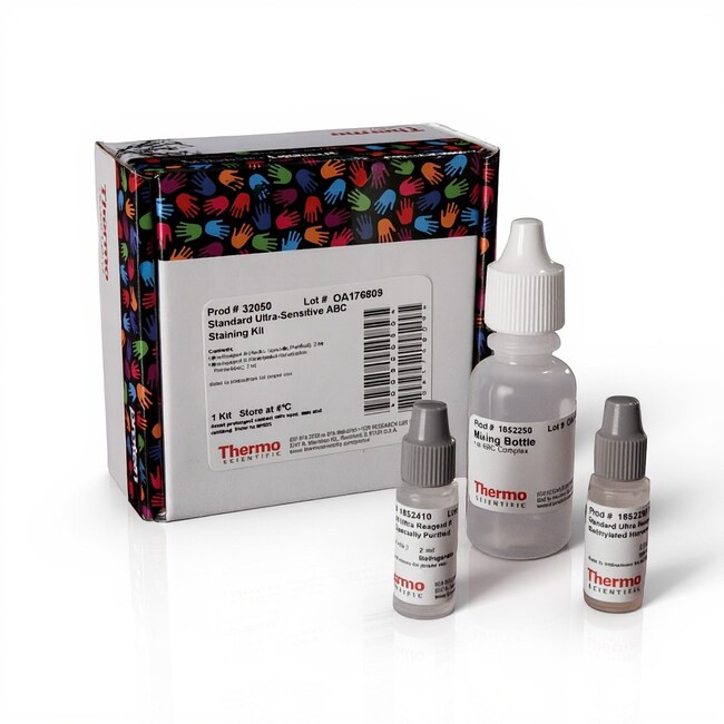 Pierce ABC Staining Kits are highly sensitive, produce very low background staining and have rapid avidin-biotin interactions. Standard Kits contain only the two essential reagents (avidin and biotinylated HRP) can be used with nearly any species of biotinylated secondary antibody. The Ultra-Sensitive ABC Peroxidase Staining Kits are approximately five times more sensitive than the regular-senstivity kit, enabling more dilute primary antibodies to be used while producing equal staining intensity. Ultra-Sensitive Kits are offered as a Standard Kit and as Complete Kits, which contain biotinylated secondary antibodies and appropriate block serum for use with mouse or rabbit antibodies, respectively.