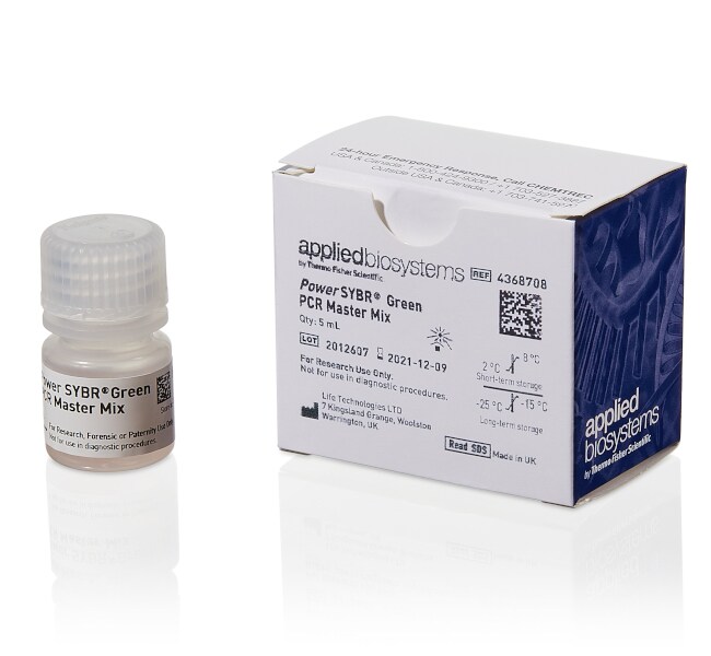 2X 混合物含有 SYBR™ Green 1 染料、AmpliTaq Gold™ DNA 聚合酶 LD、含 dUTP/dTTP 混合物的 dNTP、惰性参比染料 1 和经优化的缓冲液组分。含有 10 × 5 mL 瓶,足以进行2000次 50 µL 反应。