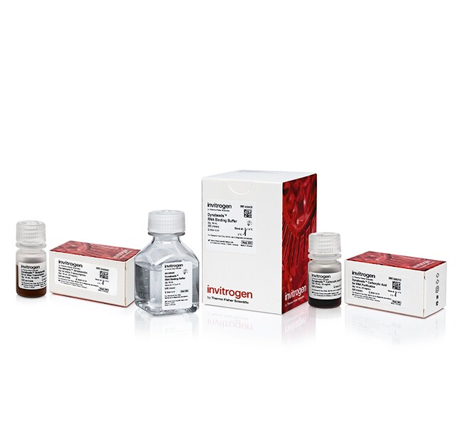 将 IVT 步骤产生的 RNA 粗产物与产品中包含的用于 RNA 纯化的 Dynabeads 羧基磁珠混合,并加入产品中包含的 Dynabeads RNA 结合缓冲液。RNA 结合到磁珠表面,反应混合物的剩余组分通过使用磁力架(见