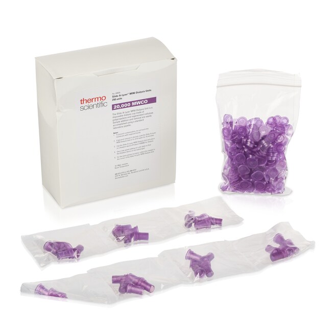 Thermo Scientific Slide-A-Lyzer 迷你透析杯 (20K MWCO) 是配有集成的低结合膜的一次性聚丙烯杯,用于透析及从 10 µL 至 2 mL 体积高效回收 >20 kDa 的蛋白和大分子。