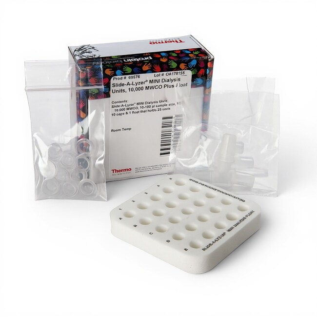 Slide-A-Lyzer 迷你透析杯 (10K MWCO) 是配有集成式低结合膜的一次性聚丙烯杯,用于透析以及以较高的回收率从 10 μL 至 2 mL 体积中回收大于 10 kDa 的蛋白和大分子。