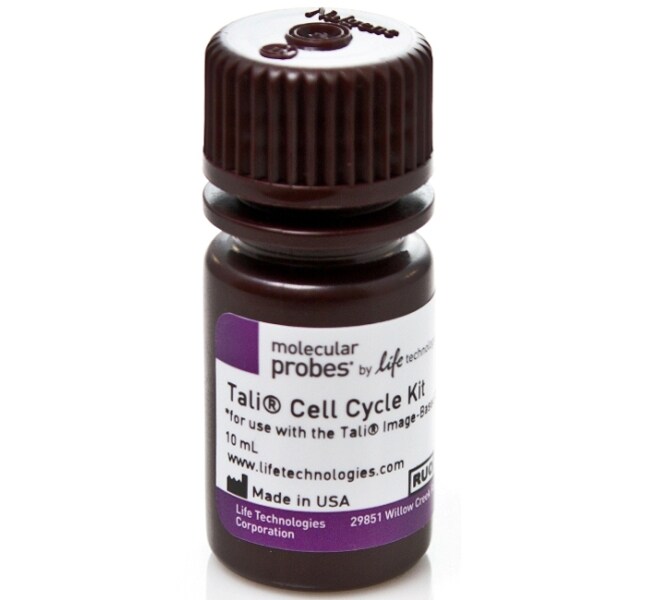 Tali™ 细胞周期试剂盒包括一种即用型试剂,与 Tali™ 成像型细胞分析仪配合使用时,可以便利、精确测定细胞周期每个阶段的细胞百分比。这种单次添加试剂由碘化丙啶 (PI)、RNase A 和 Triton X-100 组成。