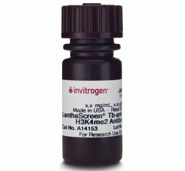 The LanthaScreen™ Tb-anti-Histone H3K4me2 antibody is a key component of the BacMam Histone H3K4me2 Cellullar Assay (A14164). When this terbium (Tb)- labeled antibody is paired with baculovirus-mediated (BacMam) expression of a Histone H3-GFP fusion protein, the TR-FRET readout enables sensitive detection of H3 lysine 4 dimethylation. The resulting high-throughput screening (HTS) compatible assay can be used to identify inhibitors of methyltransferases and demethylases acting on lysine 4 of histone H3 in the cell type of your choice.