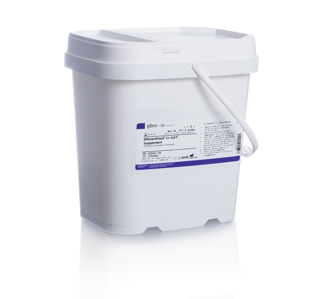 Gibco™ EfficientFeed™ C+ (Plus) AGT™ 添加剂是一体式干粉添加剂,适用于多种细胞系培养的分批补料添加,以辅助工艺开发和尽可能增加生物反应器利用率。本产品旨在用作表达内源性谷氨酰胺合成酶 (GS) 的 GS CHO 细胞系的一体式补料,无需额外使用 GS 添加剂。与初始的 CD EfficientFeed™ C AGT™ 营养补充剂相比,EfficientFeed™ C+ 补充剂具有独特的成分组合,可以实现更简单的 pH 中性复溶,并且能够将补充剂从 81.2 g/L (1X) 超浓缩至 162.4 g/L (2X),以减少产品稀释度或在适当情况下通过额外添加补料来增加滴度。本产品具有非动物源性并且化学成分确定的配方,不含蛋白质、水解物或成分不完全明确的组分。