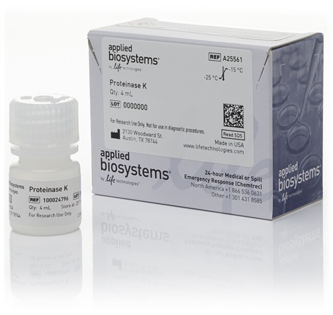 This is the same proteinase K found in the MagMAX™ DNA Multi-Sample Ultra Kit (Cat. Nos. A25597, A25598), available separately in case more proteinase K is required for a particular application.