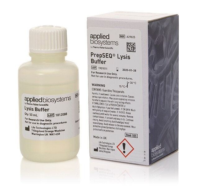 This PrepSEQ Lysis Buffer is used in the large-scale protocol of the PrepSEQ Express Nucleic Acid Extraction Kit (Cat. No. 4466351). It is not necessary for the standard protocol (sufficient lysis buffer is included in the kit's lysis tubes). As with other products in the Pharma Analytics Sample Preparation product line, PrepSEQ Lysis Buffer: