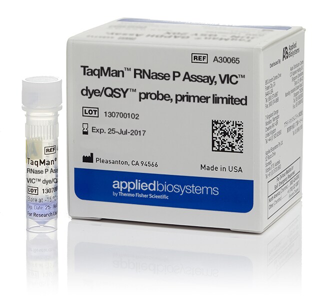 The Applied Biosystems™ TaqMan™ RNase P Assay with VIC™ dye-labeled QSY™ probe provides a pre-formulated assay for quantitating human RNase P. This assay enables relative gene expression quantification in cDNA samples when used with other gene expression assays. It consists of a VIC dye-labeled QSY probe plus sequence-specific forward and reverse primers. The assay can be used for multiplex or singleplex PCR reactions and it is primer limited, so it can be used with samples that overexpress RNase P. For a primer-limited assay with ABY™ dye-labeled probe rather than VIC dye-labeled probe, see Cat. No. 4485715.